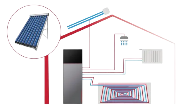 Solar thermal collector circuit for eco-efficiency and free hot water or seamless integration with existing heating sources.