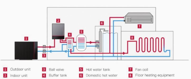 When integrated with fan coil units, our heat pump system flexibly caters to both heating and cooling demands. It efficiently circulates tempered air, swiftly adapting to your comfort preferences, making it an ideal choice for maintaining a balanced indoor climate year-round.