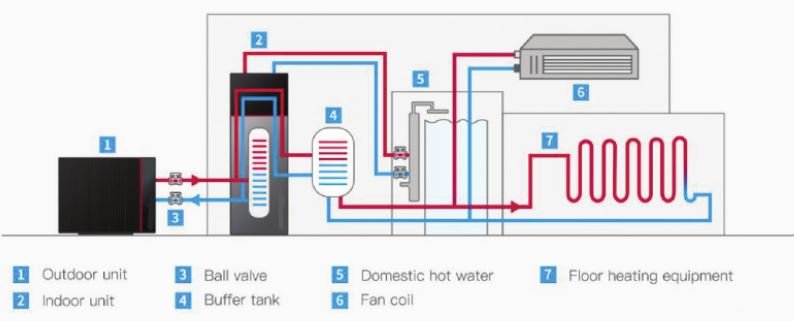 An epitome of streamlined hydraulic connections, facilitating seamless heating, cooling, and hot water functionality for residential applications.