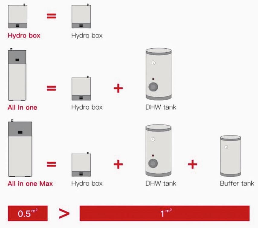 Generous 230L Domestic Hot Water (DHW) tank with a 70L Buffer Tank (BFT) in a sleek, compact design.